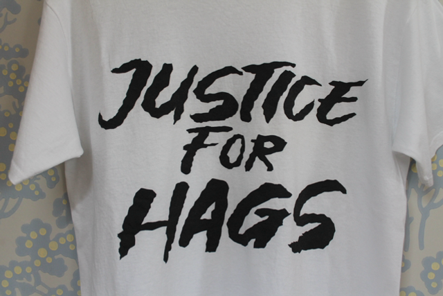 All my Justice for Hags badges and garments were inspired by a news story in which Rose Knox Peebles, an 82 year old opera actor, was criticised by a reviewer in the Financial Times for looking ‘a fright’. Quoted in The Guardian, she said; “I was furious. I hadn’t been ‘made up’ to look like a fright. That’s what I looked like. It was me. I don’t actually think I do look like a fright”, she added. “I’m perfectly happy with the way I look.”