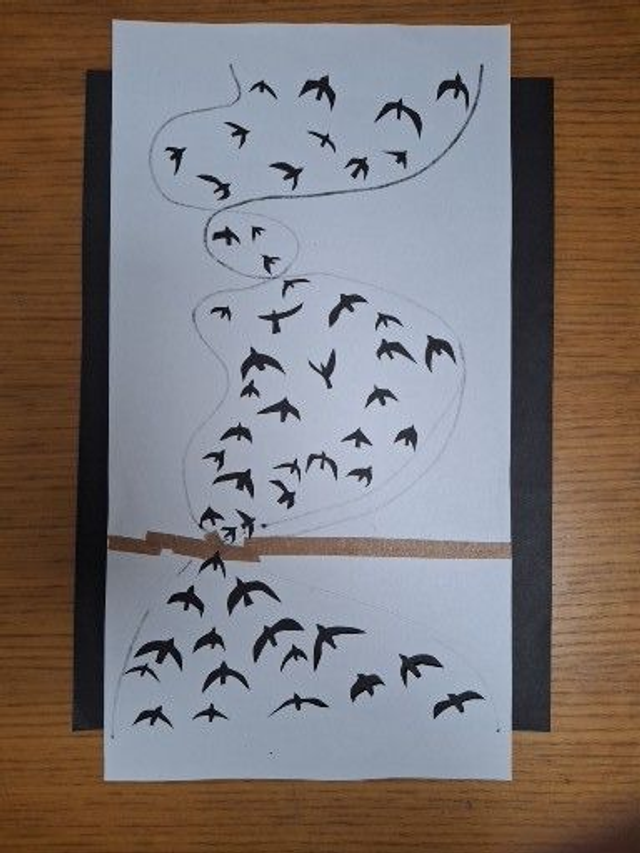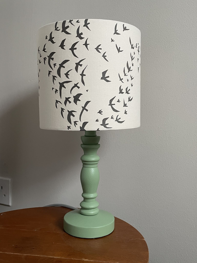 20 cm drum lampshade printed with natural dye ink made from Stockport oak trees. This mini murmuration shade has a universal fitting and can be used as a pendant or lamp. Printed onto recycled cotton using handcut paper stencils. Limited edition of 7.